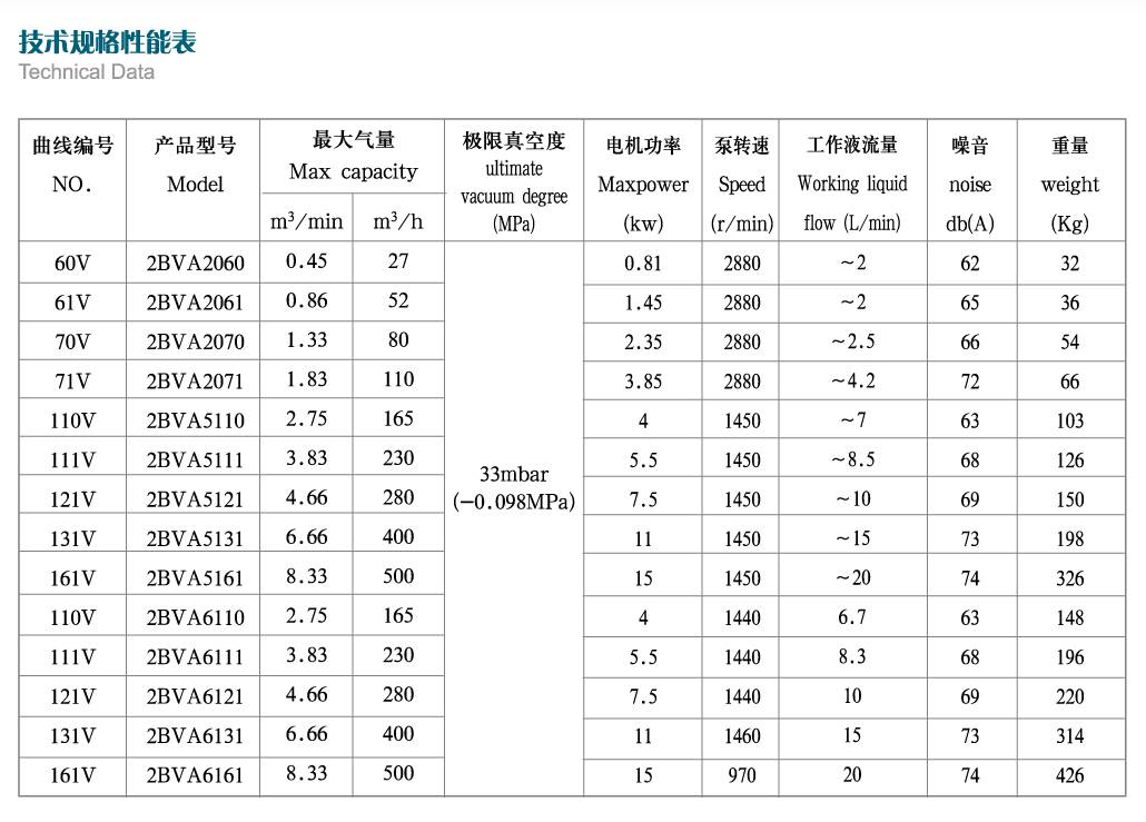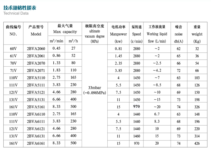 2BVA系列水環(huán)真空泵適于抽出氣體和水蒸汽,吸氣壓力達(dá)到33mbar絕圧(97%真空度),當(dāng)用變壓器油作為工作液時(稱為油環(huán)真空泵)吸氣壓力可達(dá)6.7mbar絕圧(99.3%真空度),可以完全取代往復(fù)式真空泵。當(dāng)真空泵在吸氣壓力接近極限真空壓縮機用時,其壓力最大至0.26mpa(絕圧)。2BVA系列水環(huán)真空泵作為新一代節(jié)能產(chǎn)品,以其出色的性能及眾多優(yōu)點將全面取代同性能的SK、2SK、W、WY、WL系列水環(huán)真空泵、往復(fù)真空泵。